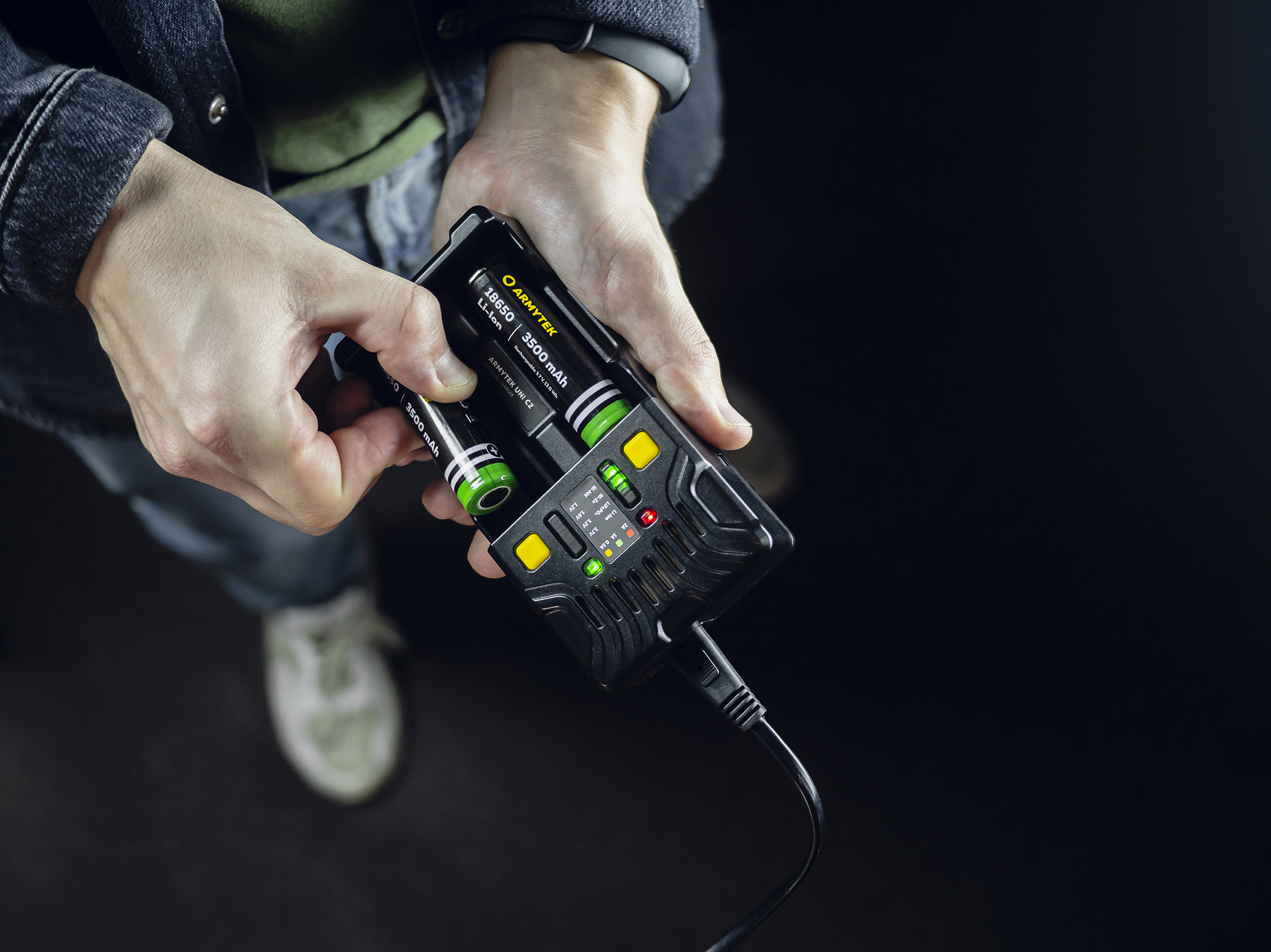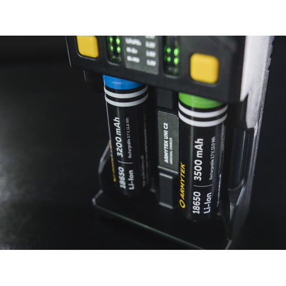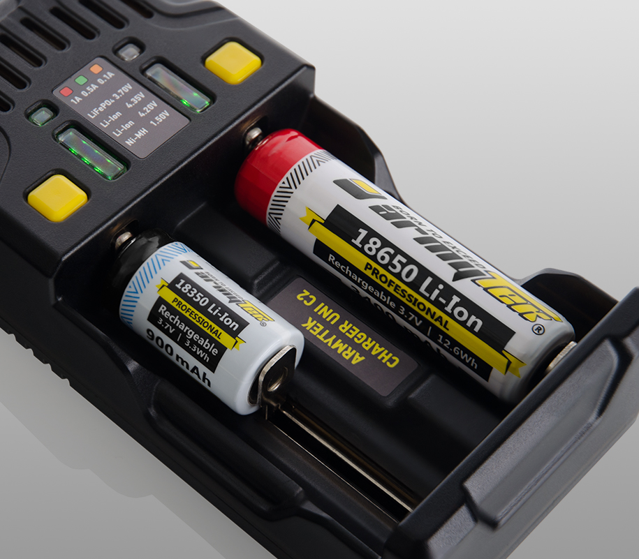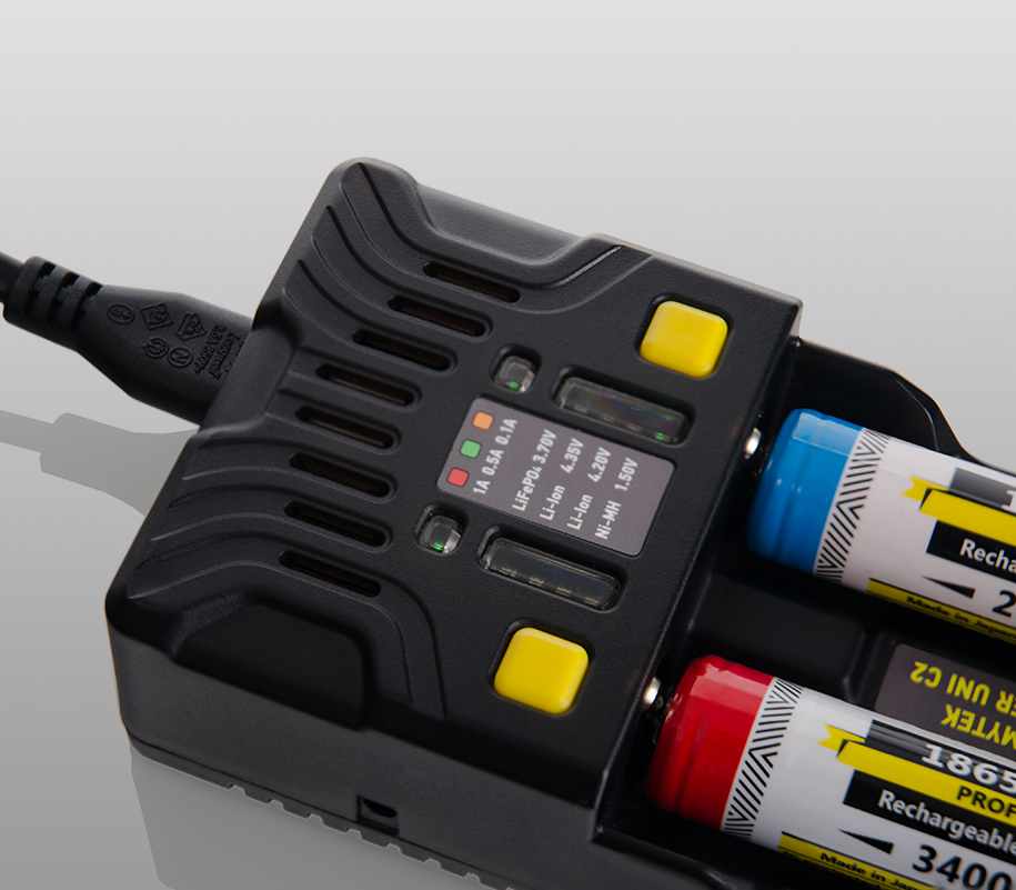 Universal charger Armytek Uni C2 supports IMR, Li-Ion 4.2V, Li-Ion 4.35V, Ni-MH, Ni-Cd and Li-FePO4 batteries.