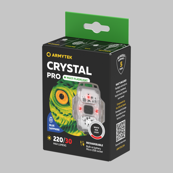 Bicycle brake light is a new feature of the Armytek compact multi flashlight, which significantly expands the areas of application. Specially for use as a brake light, Crystal Pro is equipped with a built-in 3D accelerometer. Highly sensitive sensors detect bicycle deceleration, after which additional red LEDs turn on and the brightness of the flashlight increases to 43 lumens. An included bicycle mount securely fixes the flashlight on a bike.