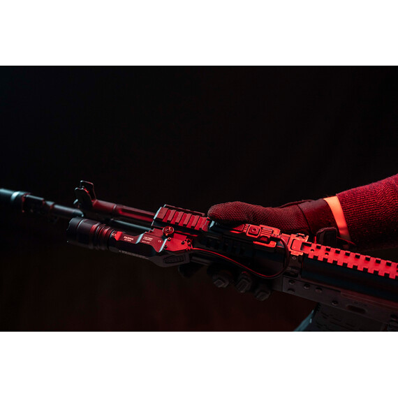 Convenient operation with one finger: large button for easy pressing even with tactical gloves. Switching lever for switching between constant light brightness modes and for activating the lock-out function.